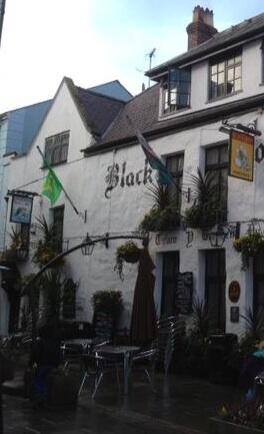 The Black Boy Inn in Caernarfon - the first place to fly the Caernarfonshire flag, Wales flag and the flag of St. David side by side.