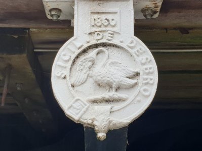 placed on Marlow Bridge when it was renovated in 1860. The legend “Sicil de Desbro” meaning ‘Seal of Desborough’, the town of Marlow being in the Hundred of Desborough, one of the Chiltern Hundreds. A local school of thought holds that an unchained, crownless, swan was used at the time of John Hampden, a prominent local Parliamentarian during the Civil War and its subsequent inclusion reflecting the restoration of the monarchy. Arguably such an unshackled swan, which as noted had been seen in some earlier versions of the Buckingham town arms, might have provided a more dynamic charge for the county flag.