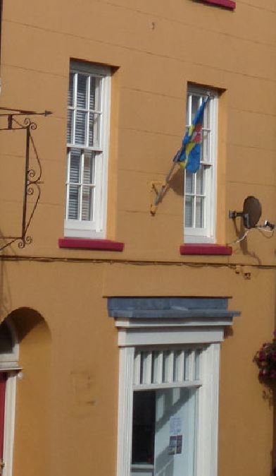 The flag of Pembrokeshire over Pembroke Castle from Leigh Cotteril.