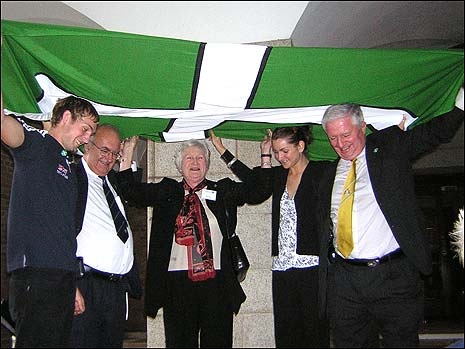 However, in spite of the controversy it engendered, the Devon Flag quickly gained popularity, “In a few months it has achieved the sort of popularity that takes years or decades for most regional flags,” observed Charles Ashburner, of Mrflag.com. In October 2006 it gained “official” recognition when Devon County Council raised the flag outside County Hall. Councillors are seen here preparing for the event.