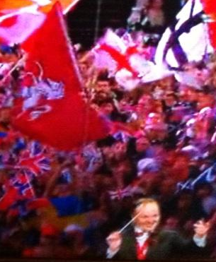The flag of Kent wielded at the Proms, amongst a sea of flags.- 2014