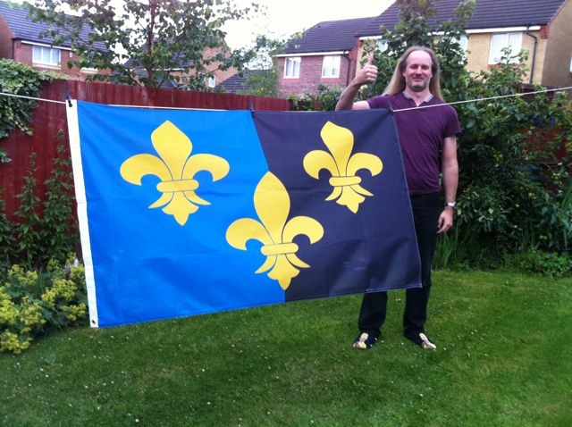 regarding a proposed flag for the county and met with an enthusiastic response. The design proposed was formed from the council arms, following research into their derivation and origin, which had revealed the long standing association of the county of Monmouthshire with the blue and black shield bearing three gold fleur de lis. The proposed flag was thus a vertical bi-colour of blue and black with three gold fleur de lis, although with some modifications that improved the design’s efficacy in flag form. Illustrations of the arms attributed to ancient Gwent, typically depict a shade of blue in the shield that is rather dark