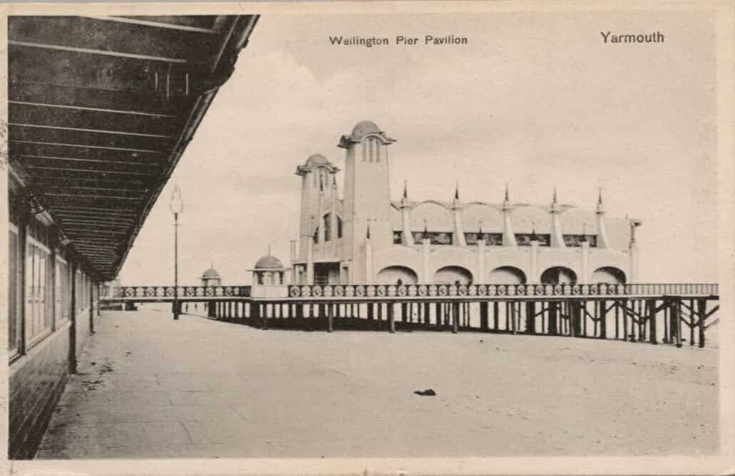 from 1908, depicting the flag flying at the Winter Gardens, also in Great Yarmouth. A photo of Wellington Pier shows East Anglia flag shields all the way around the structure, interspersed with shields depicting the town’s civic arms.