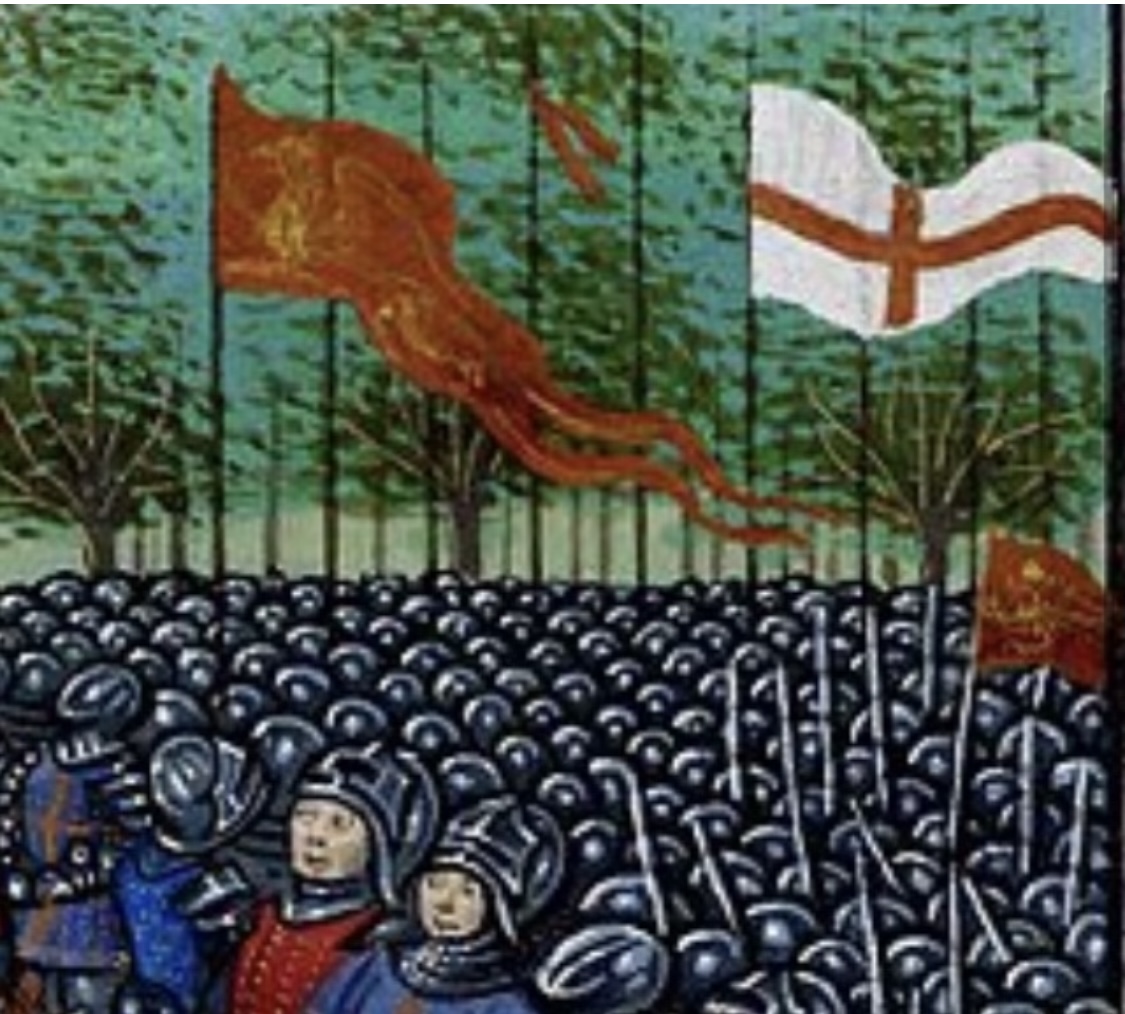 This banner was unfurled in 1245 and 1257 in the Welsh wars and again in the 1264 civil war, Battle of Lewes. It is further recorded that at the 1346 Battle of Crecy, King Edward III raised his “unconquered standard of the Dragon Gules (red)” (the colour changed from gold!) and that it appeared yet again at the 1415 Battle of Agincourt. Another notable appearance of the dragon standard is found in Jean Froissart’s 1483 account of the 1381 Peasant’s Rebellion, where two dragon standards, gold on red, are present