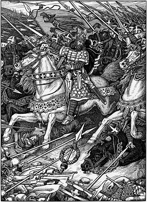 from Alfred Tennyson’s 1898 work, ‘Idylls of the King Vivien, Elaine, Enid, Guinevere’. described as “Arthur Leading the Charge at Mount Badon.”
