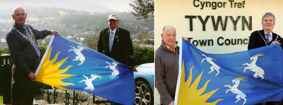 and could be seen flying or displayed around the county. It is seen here with the mayors of Dolgellau (Delwyn Evans) left and Tywyn (Ron McKoo), right