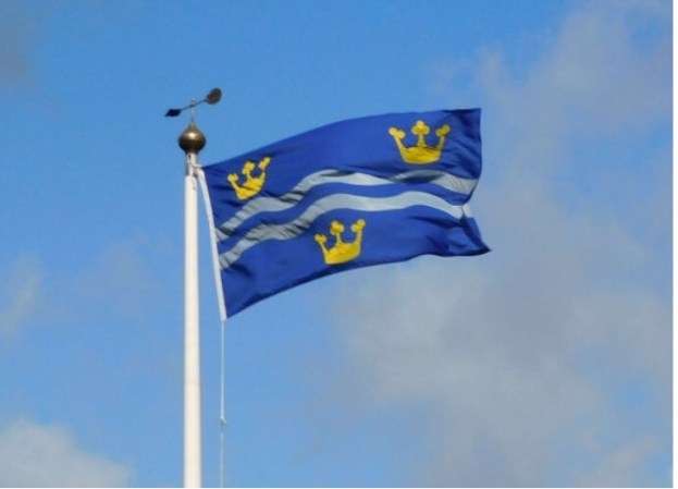 the flags of the three counties of Suffolk, Essex and Cambridgeshire are seen together at the tripoint where they converge.
