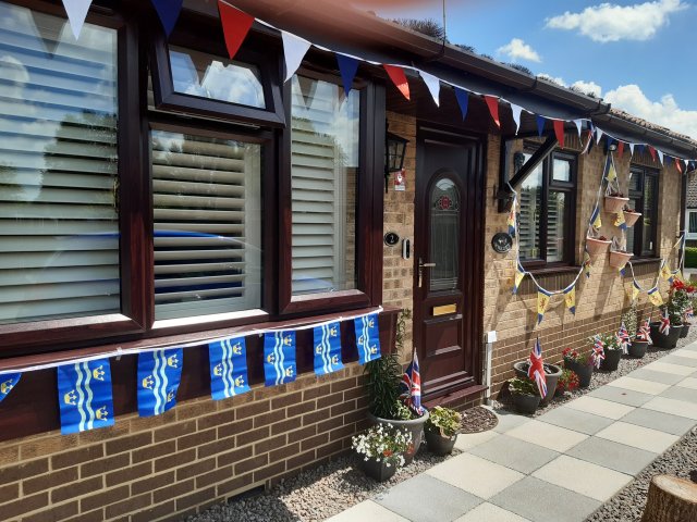 is decorated in Cambridgeshire flag bunting.