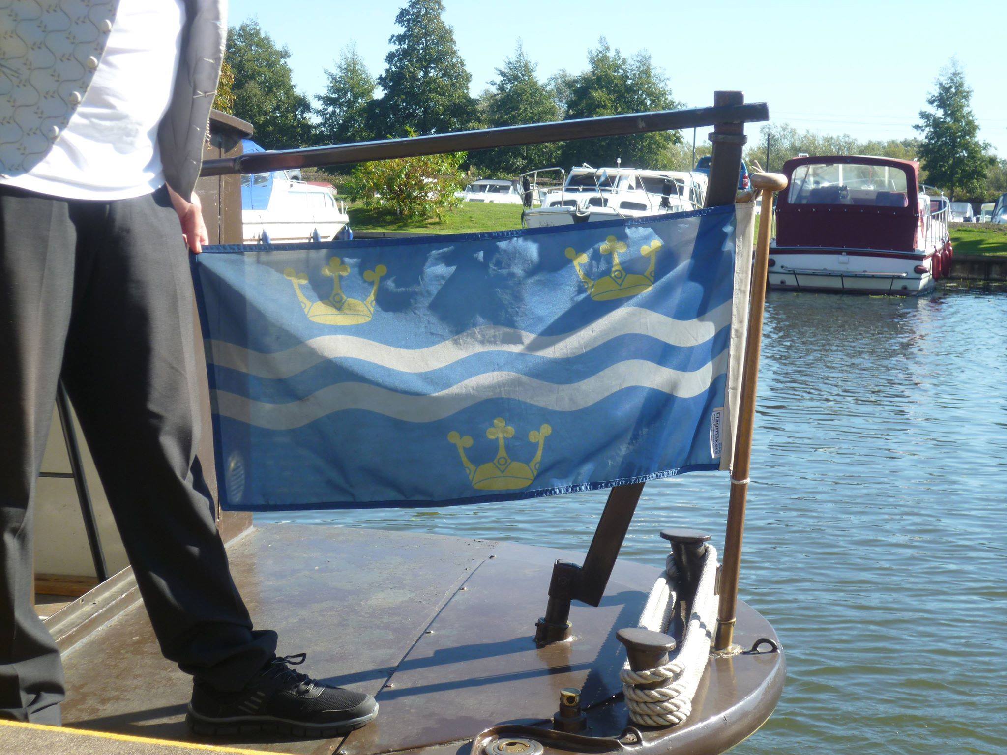 the Cambridgeshire and Suffolk flags mark a footbridge at Isleham Marina, spanning the river Larkh, which forms the mutual county boundary. Below