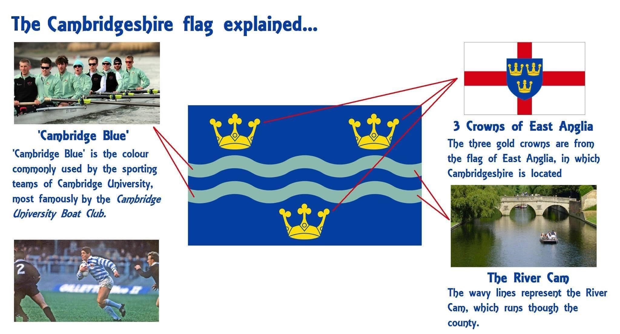 The three gold crowns represent East Anglia, in which Cambridgeshire is located. They are placed against a blue field which is the same shade used on the East Anglia Flag
