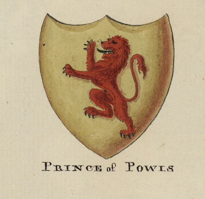 used by the the Mathrafal dynsasty of the kingdom of Powys, later Powys Wenwynwyn or Powys Cyfeiliog, which features a red lion rampant against a gold field.