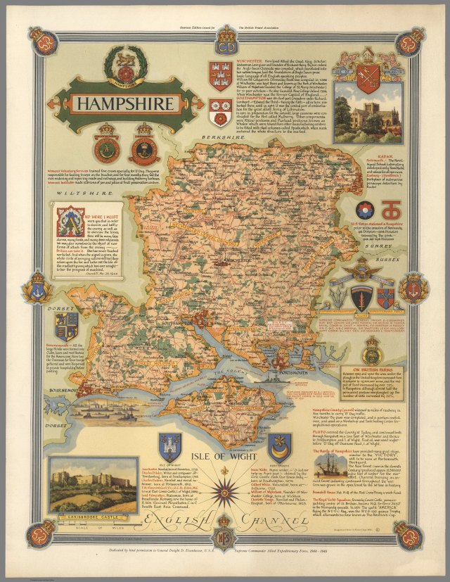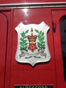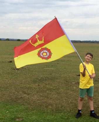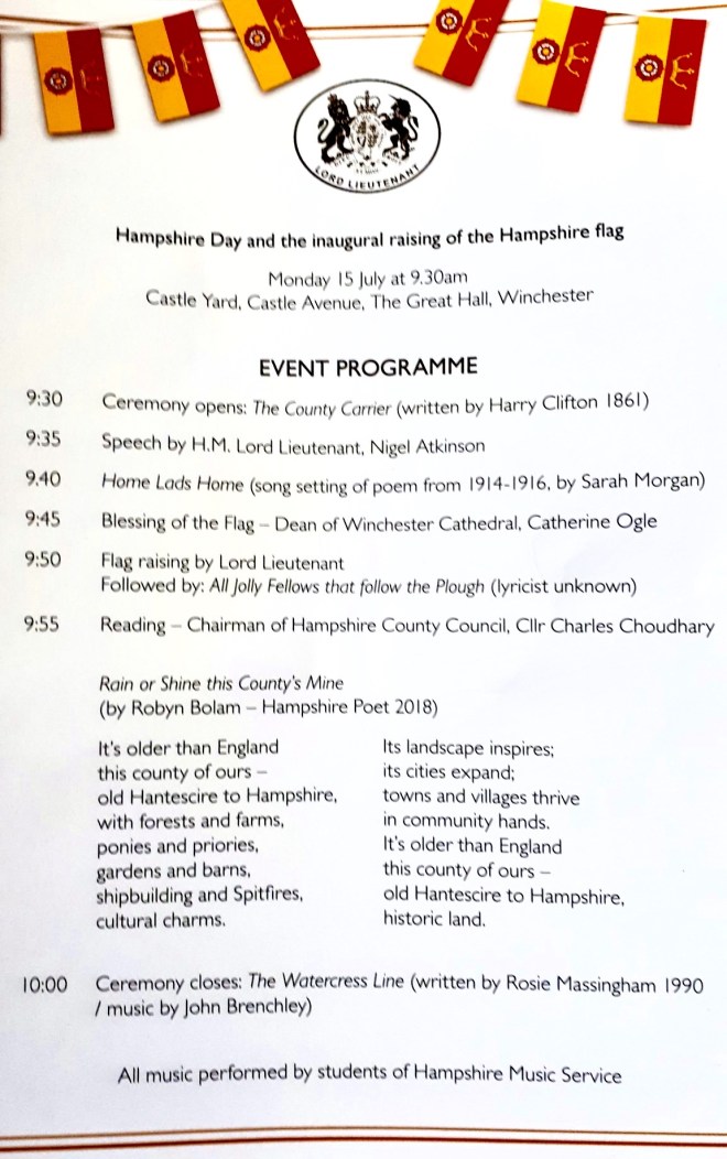 beneath the county flag. This description also recalls the fact that for a century or two, Hampshire was often the first shire, which many visitors to the UK encountered, when passenger bearing vessels frequently docked at Southampton, on the county’s coast.
