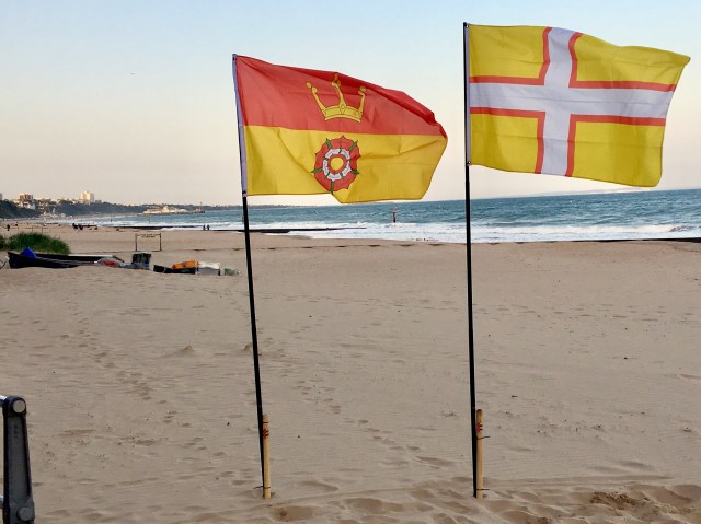 was a rough illustration using existing elements from other flags and arms, just to present the idea and “see how it looked” ! Unexpectedly, a flying version of this original form of the flag, with a slightly differently oriented rose, was spotted at the Square Tower in Old Portsmouth